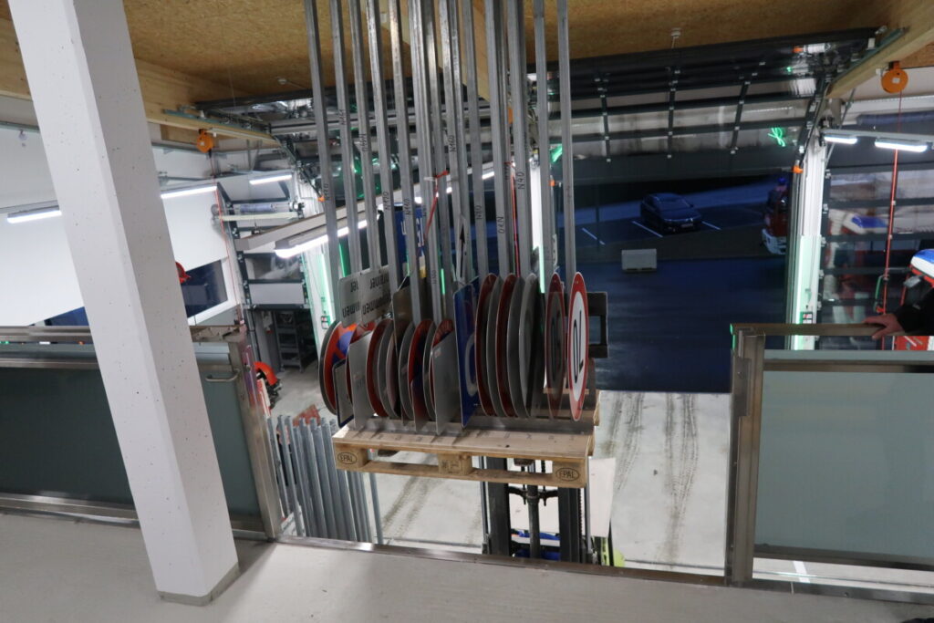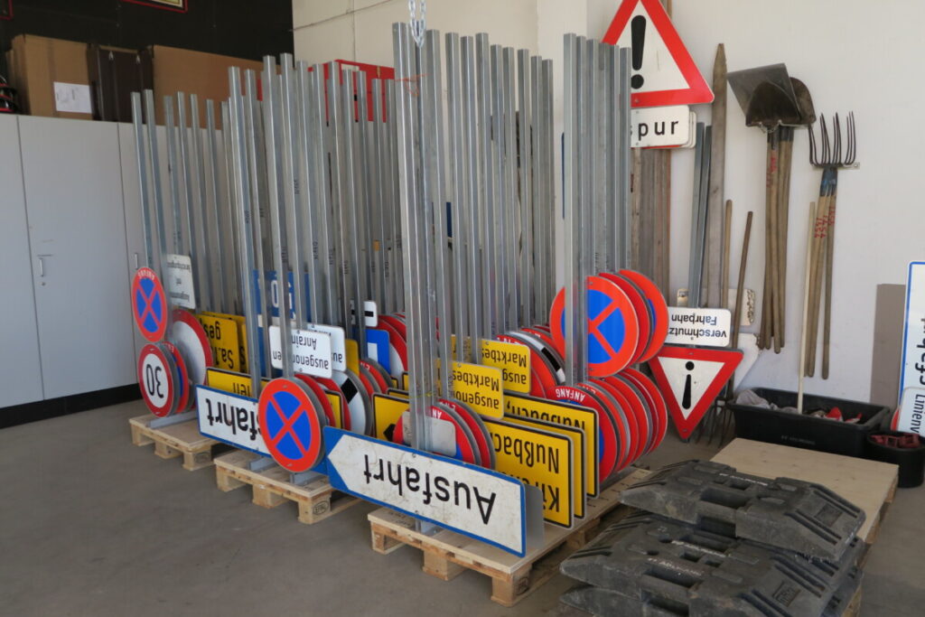 Um den umfangreichen Verkehrsmaßnahmen gerecht zu werden, wurde ein optimiertes System für Lagerung, Transport und Aufstellung der Verkehrstafeln entwickelt. Die Tafeln sind auf Paletten mit speziellen Halterungen montiert, wodurch der Aufbau deutlich erleichtert wird. Jede Position ist katalogisiert und eindeutig markiert, was die Logistik und den Ablauf wesentlich verbessert.